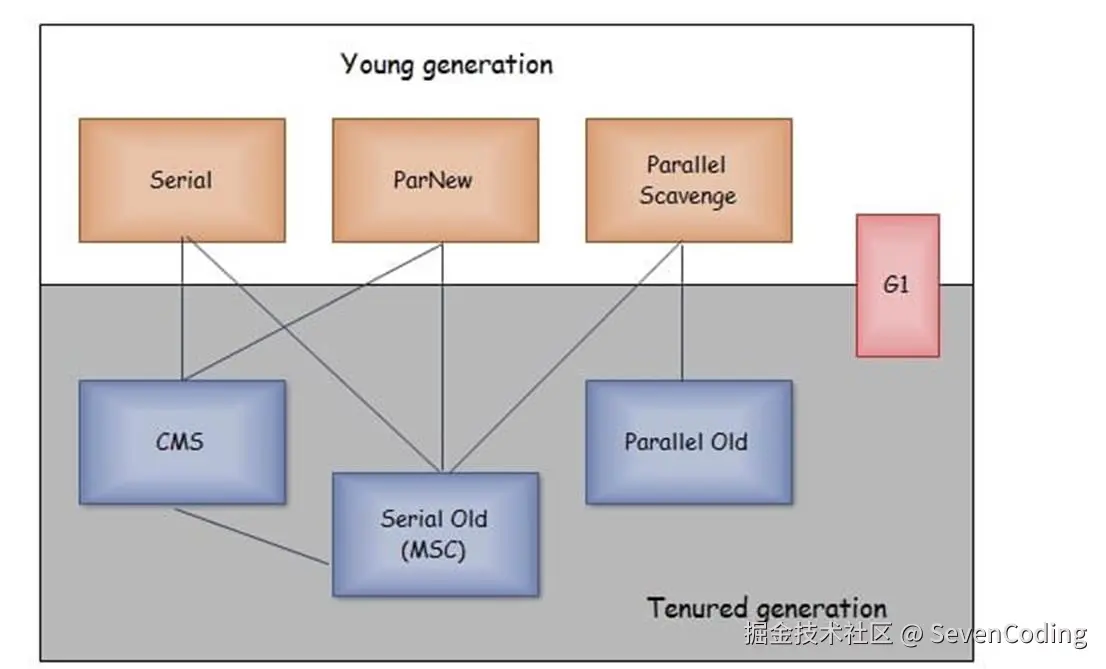 以上是 HotSpot 虚拟机中的 7 个垃圾收集器,连线表示垃圾收集器可以配合使用。