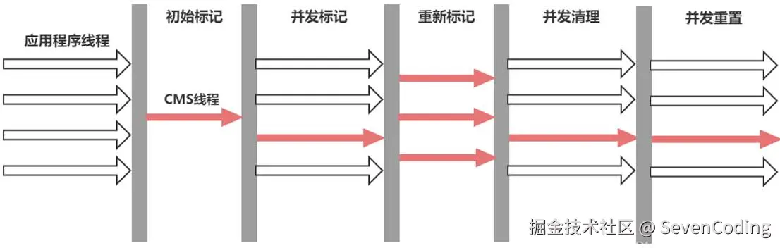 - 并发清理(Concurrent sweeping):CMS 进行并发清除阶段,标记为不可达的对象会被清除。此过程与应用线程并发运行,旨在减少停顿时间。