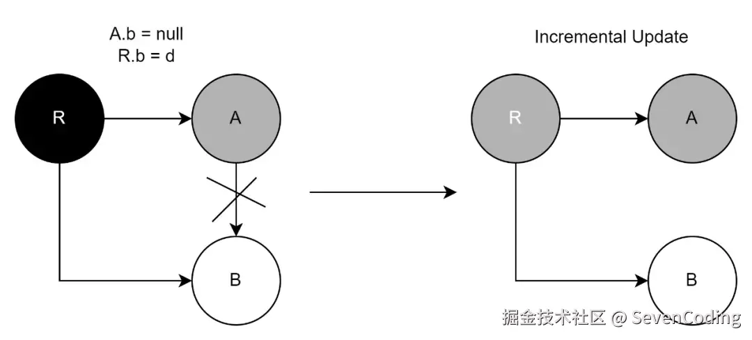 CMS基于这种错误标记的解决方案是采取写屏障 + 增量更新Incremental Update , 在业务线程发生对象变化时,重新将R标识为灰色,重新扫描一遍,Incremental Update 在特殊场景下还是会产生漏标。即当黑色对象被新增一个白色对象的引用的时候,记录下发生引用变更的黑色对象,并将它重新改变为灰色对象,重新标记。