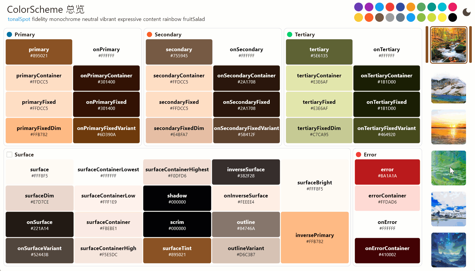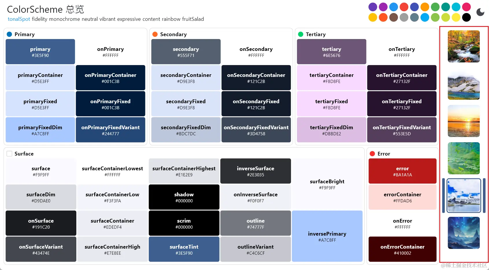 在上一篇中:《 Flutter 百题斩#14 | 说说你对 ColorScheme 的了解》 中做过一个 ColorScheme 色系的展示效果。本文就基于这个案例,实现一个从图片中取出主题色的功能,并通过左侧面板展示色彩效果。如下所示: