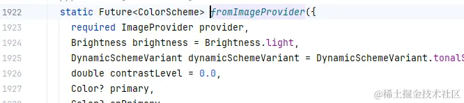 在查看 ColorScheme 源码时,发现了一个有意思的静态方法 fromImageProvider : 如下所示,其中传入一个 ImageProvider 对象,顾名思义是通过一个图片来获取主色,然后生成 ColorScheme 主题色对象 :