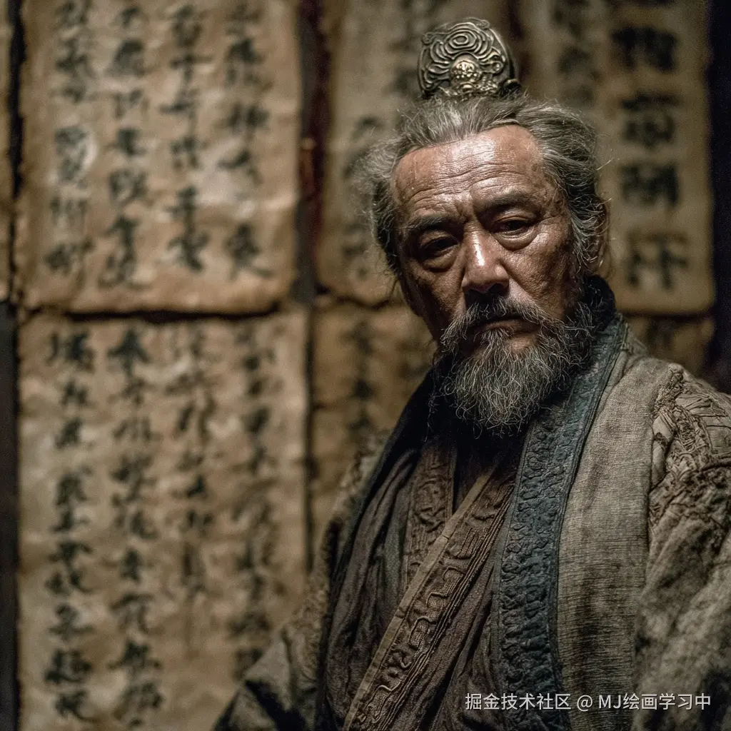 秦末谋士范增全身像,70岁智者,银须白发,目光锐利,深刻皱纹,身穿深褐色麻布深衣配宽袖,头戴高顶布冠,手持木杖立于军帐中,背景有竹简地图与青铜油灯,烛光昏暗投射戏剧性阴影,皮肤与布料老化质感写实,电影级光影,细节高清 --ar 3:4 --style raw --v 7.0