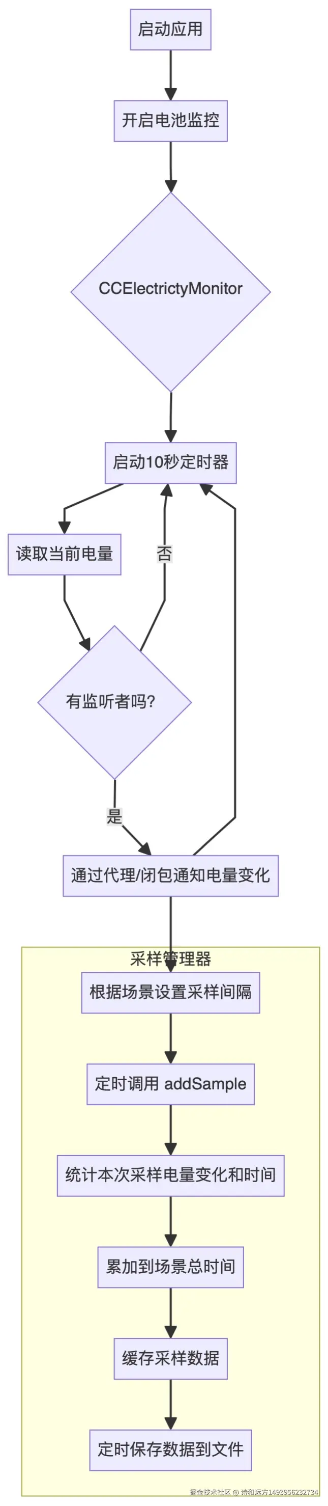 本文档结合 CCElectrictyMonitor 和 CCElectricitySampleManager 两个模块的代码,介绍 iOS 应用中电量监控的整体方案、工作流程及统计功能,并附带流程图以便理解。