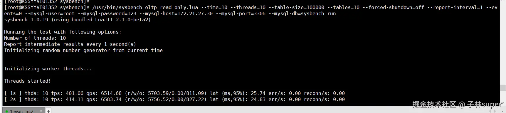 [root@KSSYYVI01352 sysbench]# /usr/bin/sysbench oltp_read_only.lua --time=10 --threads=10 --table-size=100000 --tables=10 --forced-shutdown=off --report-interval=1 --events=0 --mysql-user=root --mysql-password=123 --mysql-host=172.21.27.30 --mysql-port=3306 --mysql-db=sysbench run