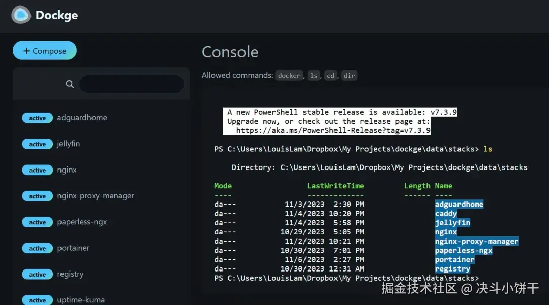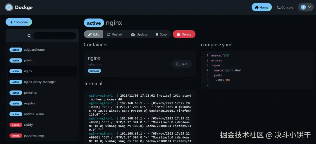Dockge 是一个开源免费(MIT license)、易于使用且响应迅速的自托管 docker compose.yaml 堆栈型管理器。通过 Dockge 可以轻松的管理你的 compose.yaml 文件(创建、编辑、启动、停止、重启和删除),提供 compose.yaml 交互式编辑器、交互式网页终端等功能。