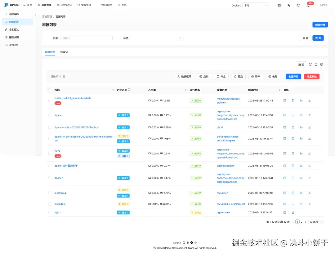 DPanel 是一款开源、轻量化的 Docker 可视化管理面板,原生的中文的界面,更适合中文环境使用。同时支持英文、日文等多种语言。安装简单,占用资源极低,更适合各种 Nas 设备、盒子以及小型服务器。面板以容器的方式运行,不需要特权,对宿主机没有依赖及侵入,安全可靠。面板提供了容器、Compose、镜像等容器管理的基础功能。