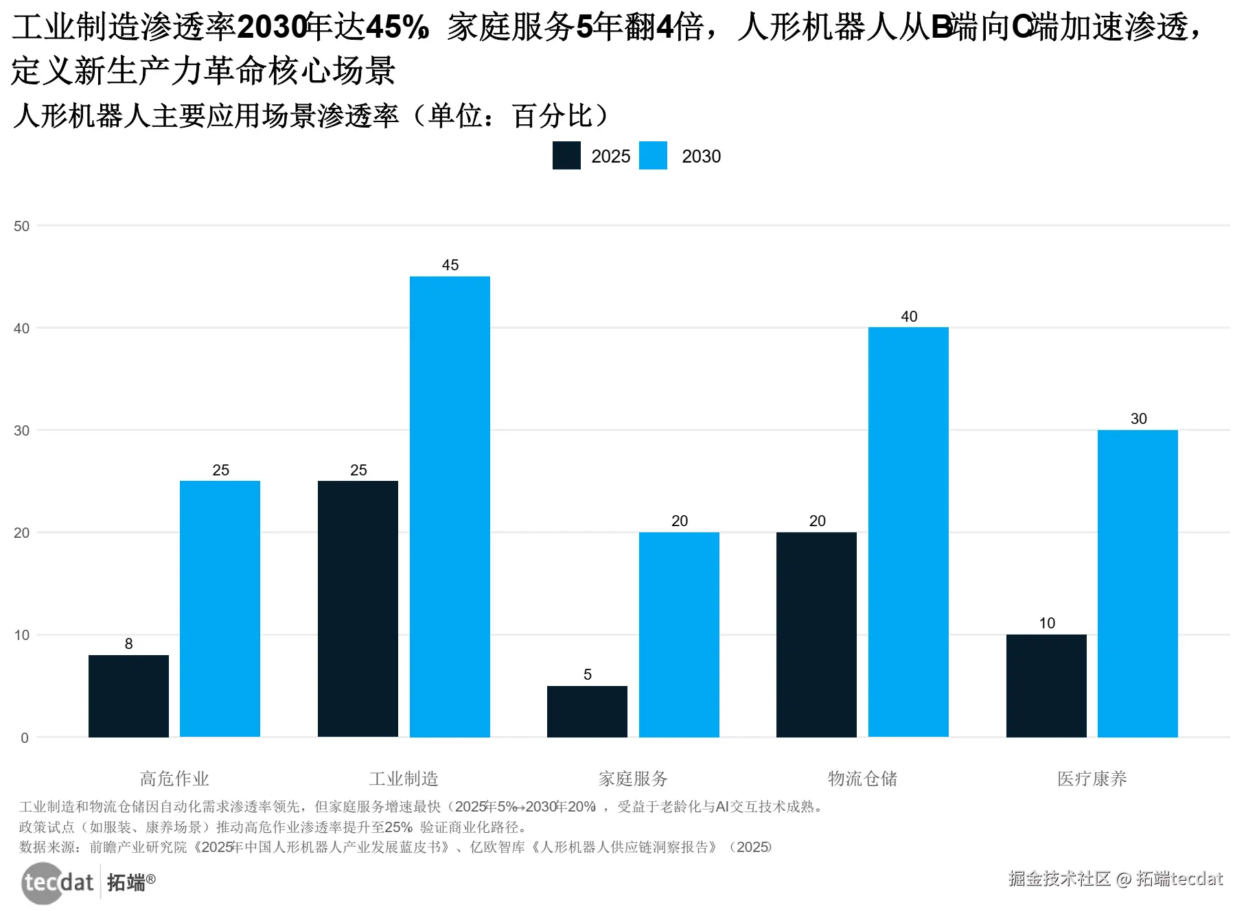 人形机器人应用场景渗透率预测(2025 vs. 2030年)图表数据及PDF模板已分享到会员群