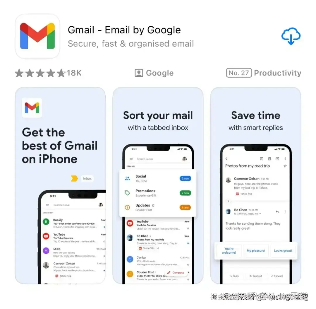 步骤一:在 Appstore 下载Gmail,安卓用户在谷歌商店或直接搜索 Gmail apk 下载