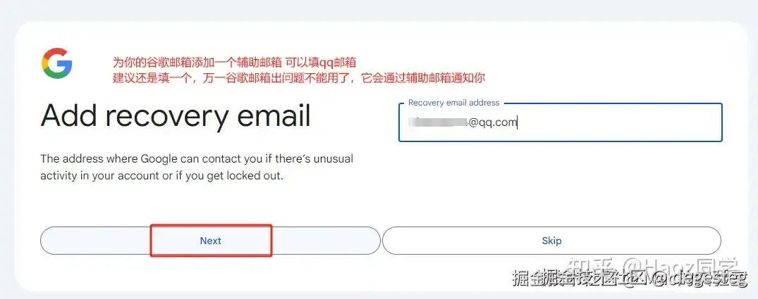 步骤六:添加辅助邮箱,点 Next,我们就完成注册了。