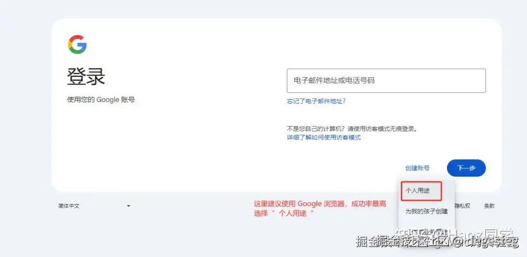 步骤一:打开 Google 浏览器主页,点击右上角”登录“,选择”创建账号“——”个人用途“,点击下一步。