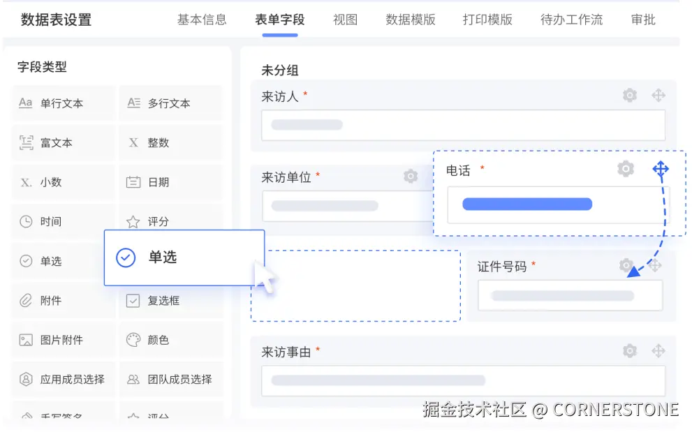 表单驱动的低代码开发模式核心围绕表单数据,通过软件系统中的业务流程来驱动表单,从而对业务表单数据进行分析和设计,适合轻量级应用场景构建。在这种模式下,开发者主要通过设计表单的结构和样式,添加字段和验证规则,以及关联业务流程来创建应用。常见的应用场景包括各类信息收集表单、审批流程表单等。