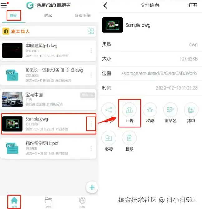 1、手机端:在浩辰CAD看图王手机版中修改好图纸之后,点击界面上方的保存,保存后的CAD图纸显示在“首页—最近”列表中,点击图纸后面三个点,选择“上传”,点击“云图”。可以选择已经创建的项目,也可以新建一个项目,上传后,修改后的图纸自动同步到云图。