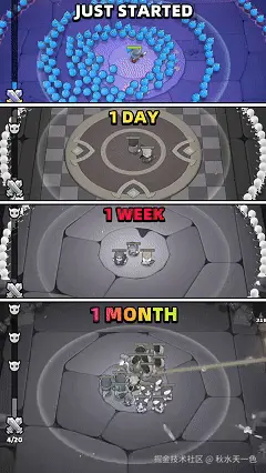 技能特效、音效与满屏敌人形成包围圈带来的强烈刺激感算是塔防肉鸽的兜底素材,不需要构图、编写剧情,主要闪光够亮、音效够帅,玩家都愿意停下20s看你在OLED屏幕上放一场绚烂的烟花。当然,割草特效之间亦有差别。