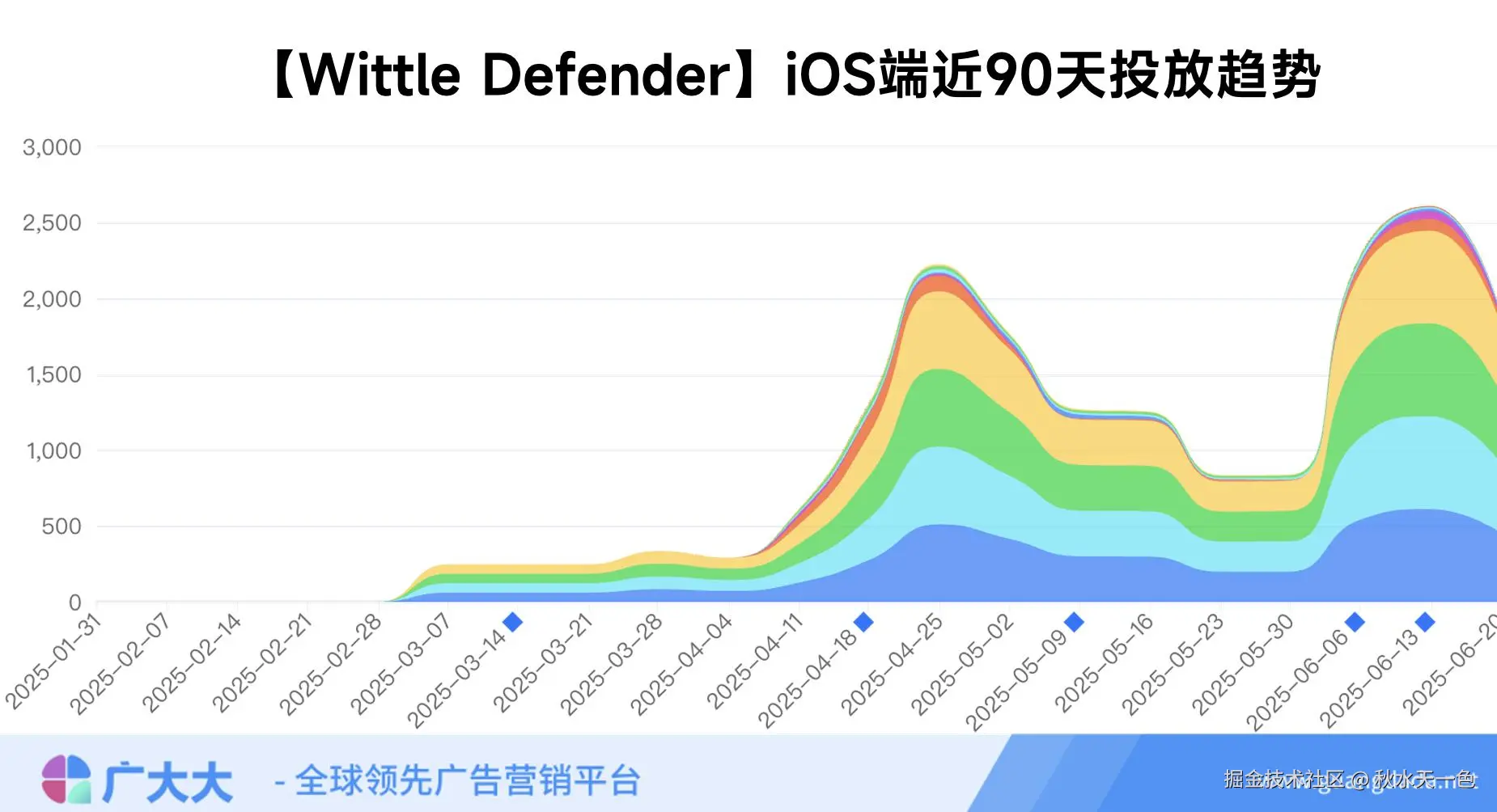 比起公式化做题的玩法和商业化模型,【Wittle Defender】的投放买量策略明显更加有趣。根据广大大-广告主分析功能数据显示,【Wittle Defender】自2025年3月7日开始投放,截止到发稿当日(6月27日)总计投放113天,双端累计投放去重素材2.4万条。依照发行顺序,可以将【Wittle Defender】大致分为3个投放阶段: