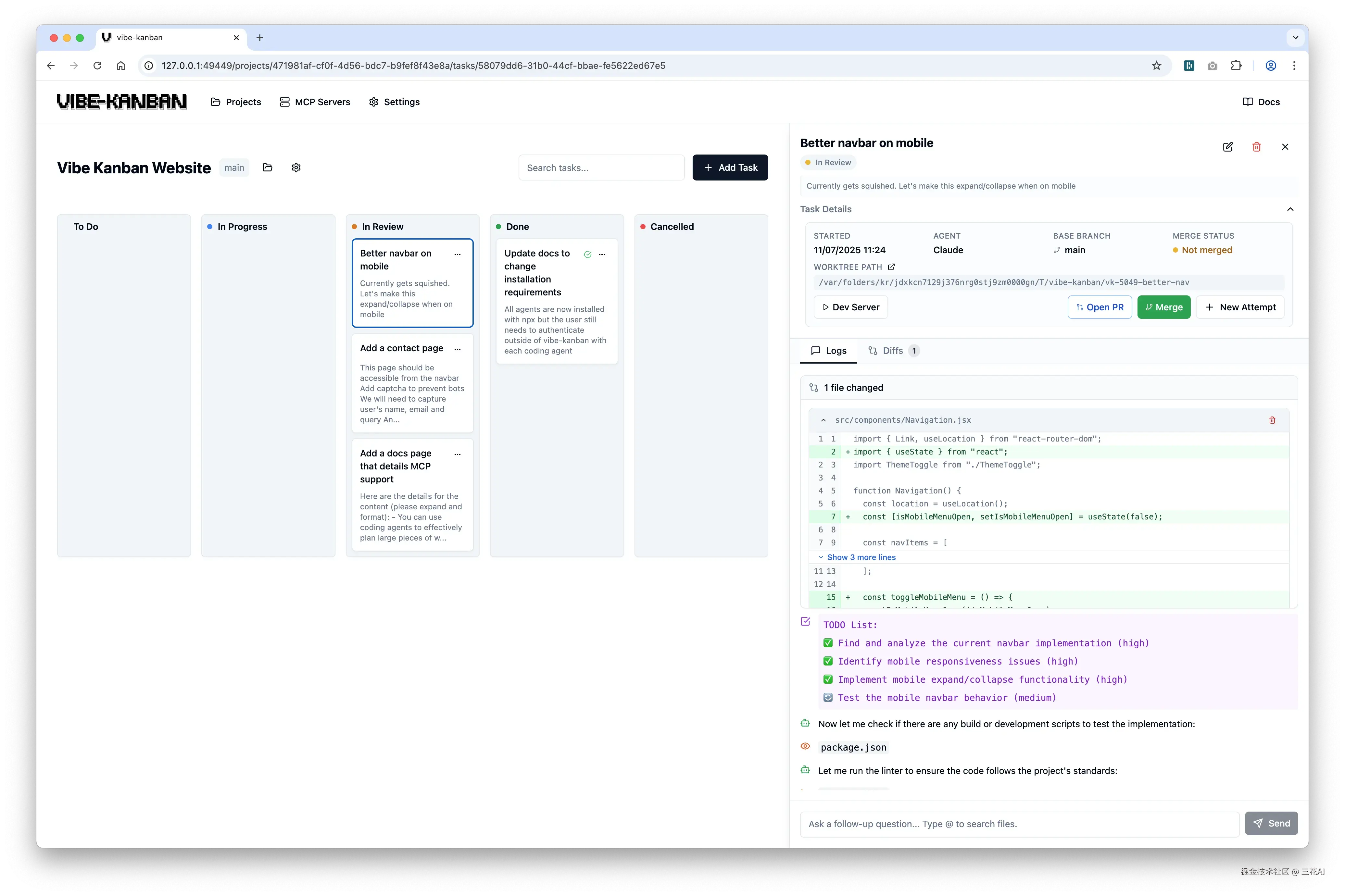 vibe-kanban:专为 AI 编程代理设计的任务协调看板工具