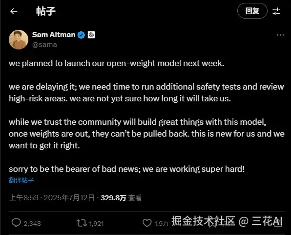 “原计划下周推出一个开放权重模型,但决定推迟。