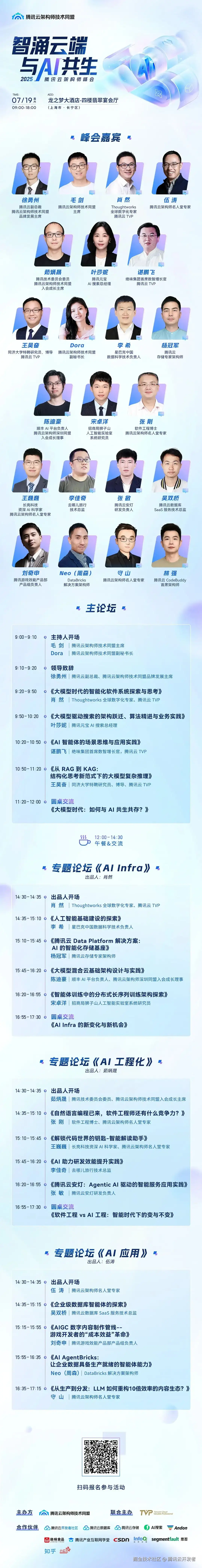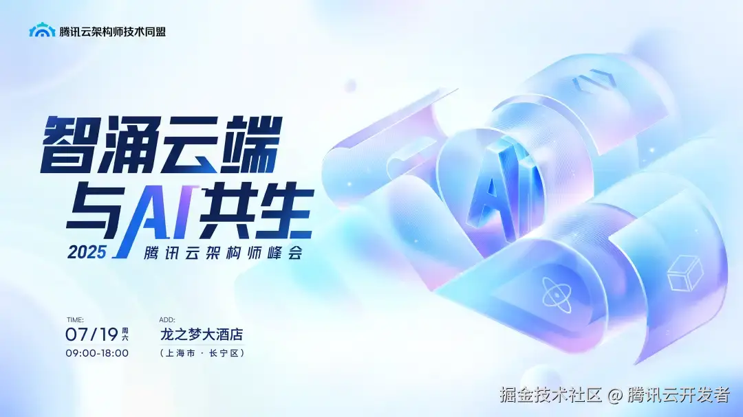 7 月 19 日,由腾讯云架构师技术同盟与腾讯云 TVP 联合主办的**「智涌云端,与 AI 共生」2025 腾讯云架构师峰会将在上海梦之龙大酒店 · 四楼翡翠宴会厅**举行。峰会齐聚数十位企业领袖、技术管理者、资深架构师、高校学者等重磅嘉宾,围绕 AI 基础设施、工程化落地、AI 应用等热门话题展开,通过前沿架构技术解读、真实案例解析,产学研跨界互动讨论等,探索架构师与 AI 共同进化路径,助力架构师提升竞争力。
