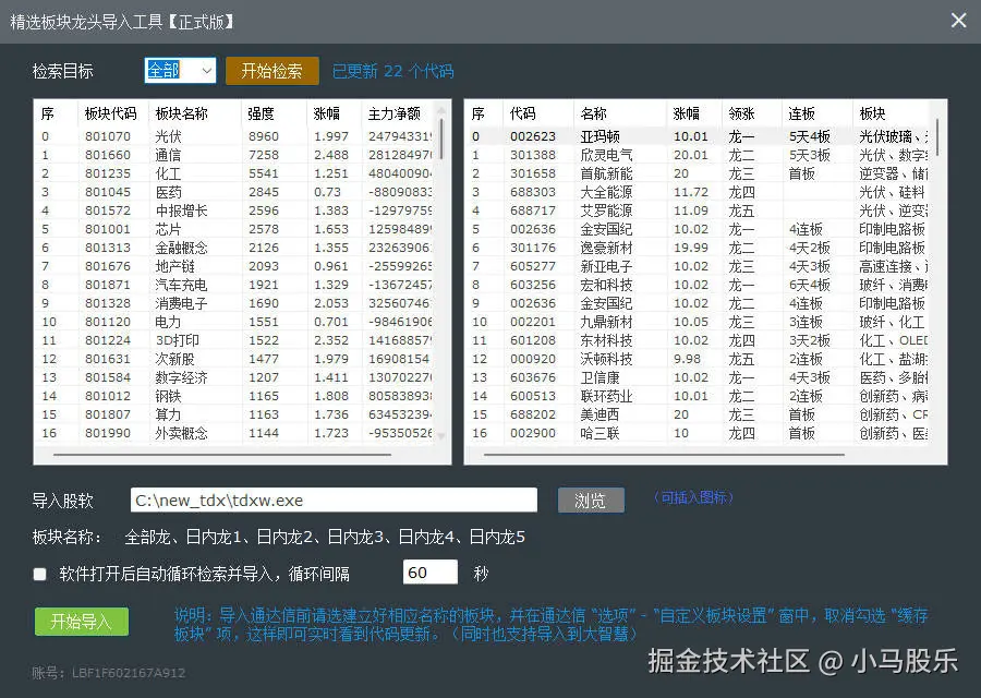 精选板块龙头股实时导入同步 小马股乐 2025-07-14 346 阅读1分钟 KPL盘中所有精选板块中,所有龙头股(含龙一、龙二、龙三等字样)的股票,实时同步到通达信的自定义板块中,同时也支持点击某只龙头股,联动通达信显示该股分时或K线。 操作简单,只要按界面提示,设置好不缓存板块,事先建好”日内龙一“、”日内龙二“、”日内龙三“、”日内龙四“等名称的板块,即可在股软中实时接收这些龙头股。