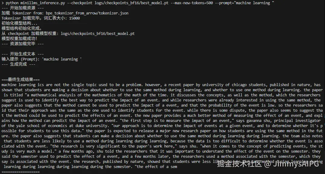 光看数字不够直观,我们让它根据“machine learning”这个提示词写一段话看看: