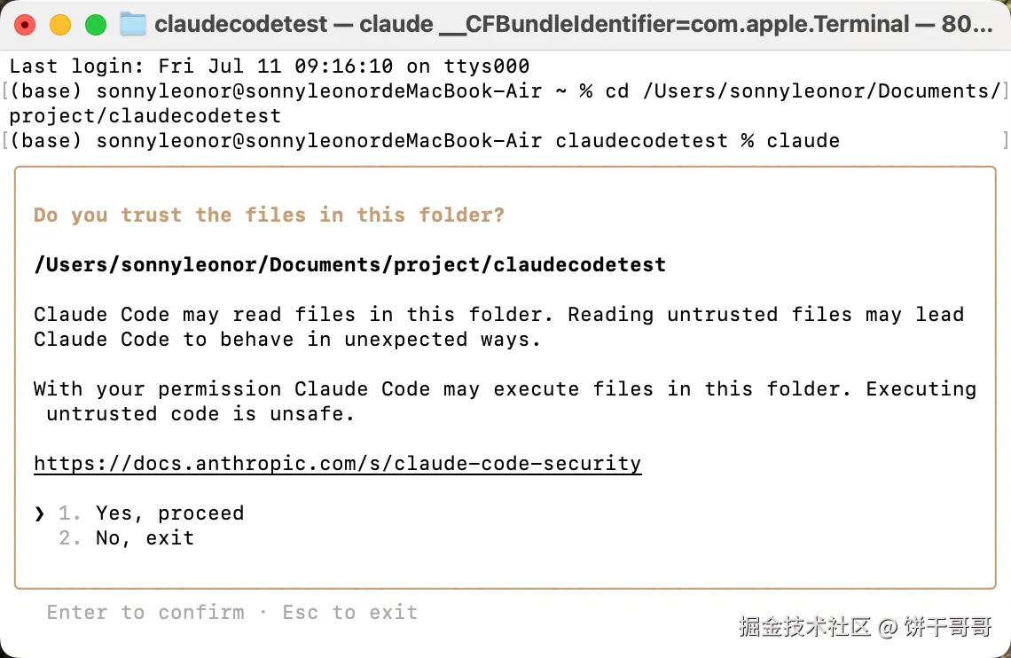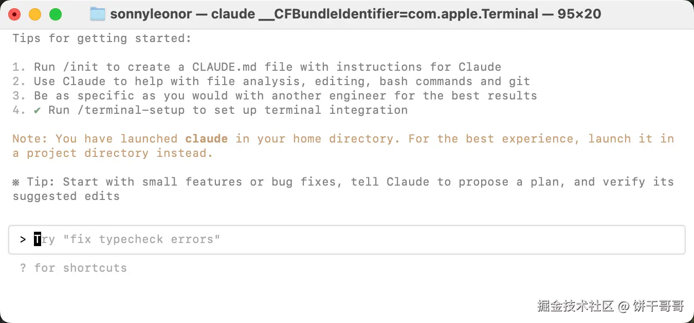 因为我是直接打开 Terminal,claude 提醒我这是 home 文件夹,让我切换到项目文件夹下,这样比较好管理文件。