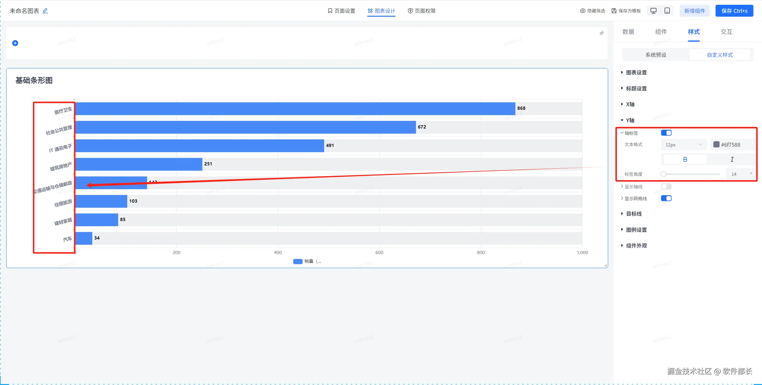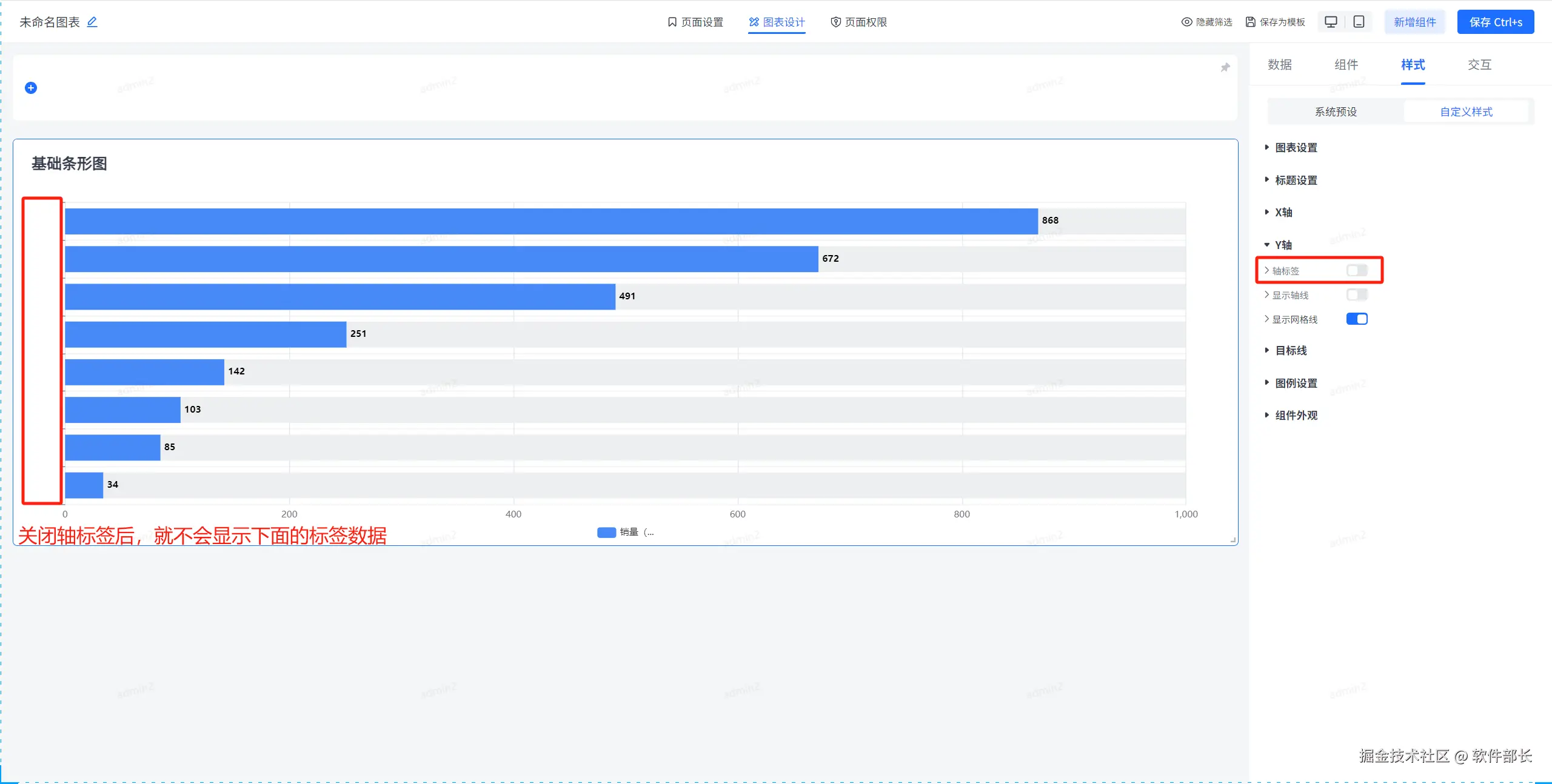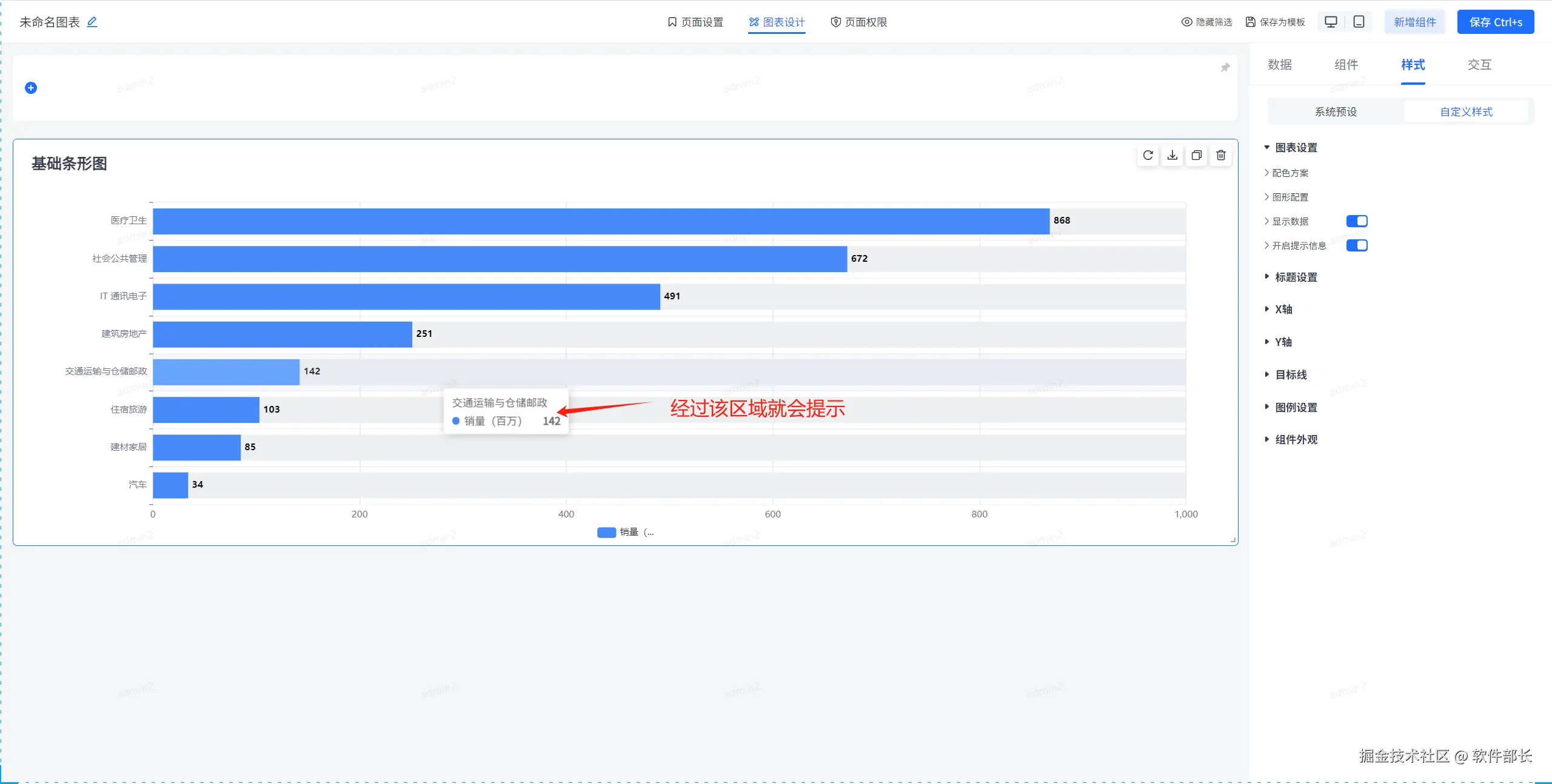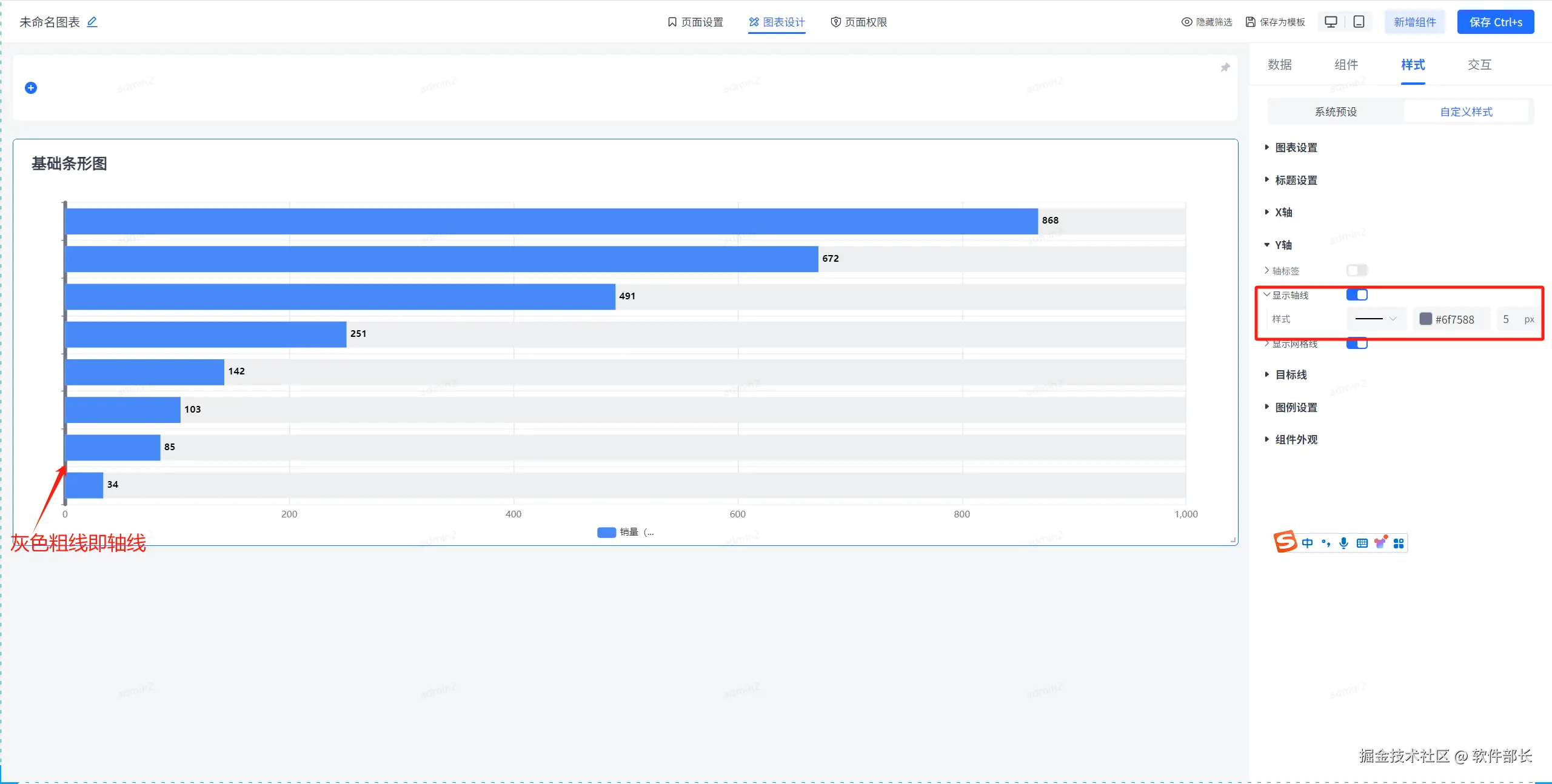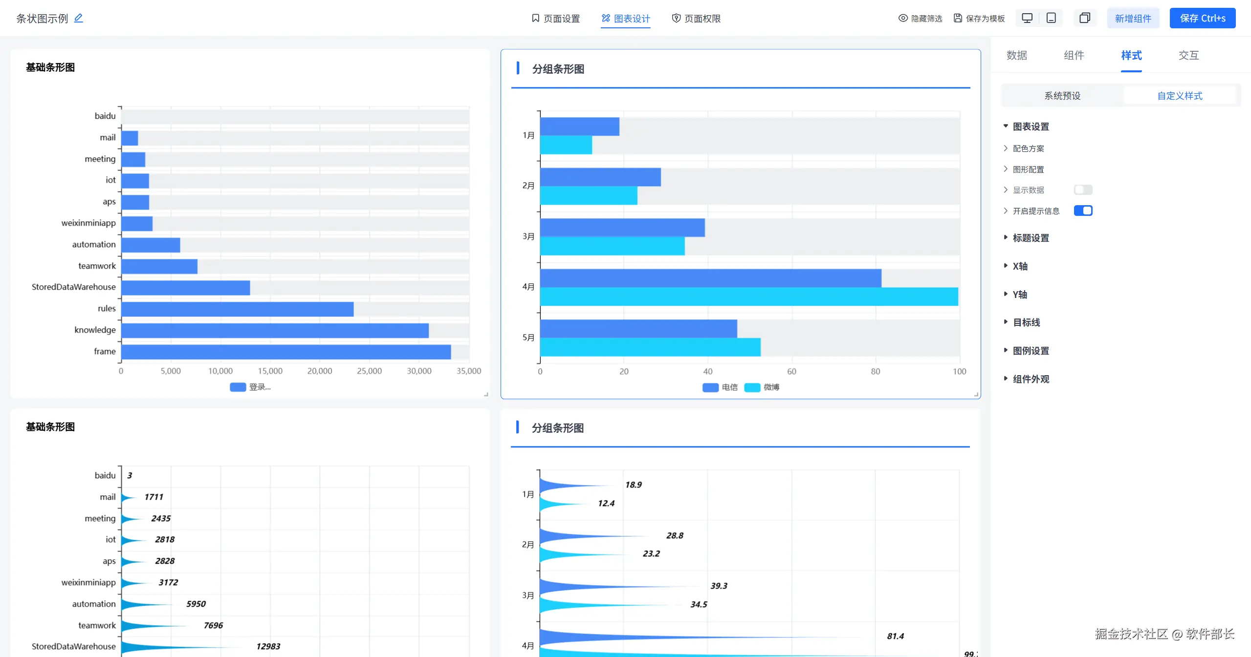 进入到图表设计,点击选择基础条形图,选择后点击【样式】下的【自定义样式】。就可以看到大致分为【图表设置】、【标题设置】、【X轴】、【Y轴】、【目标线】、【图例设置】、【组件外观】这几个大的模块。