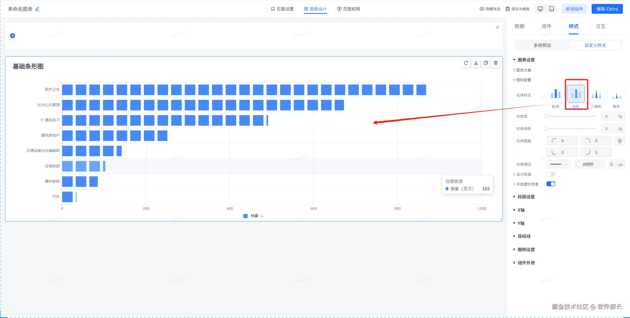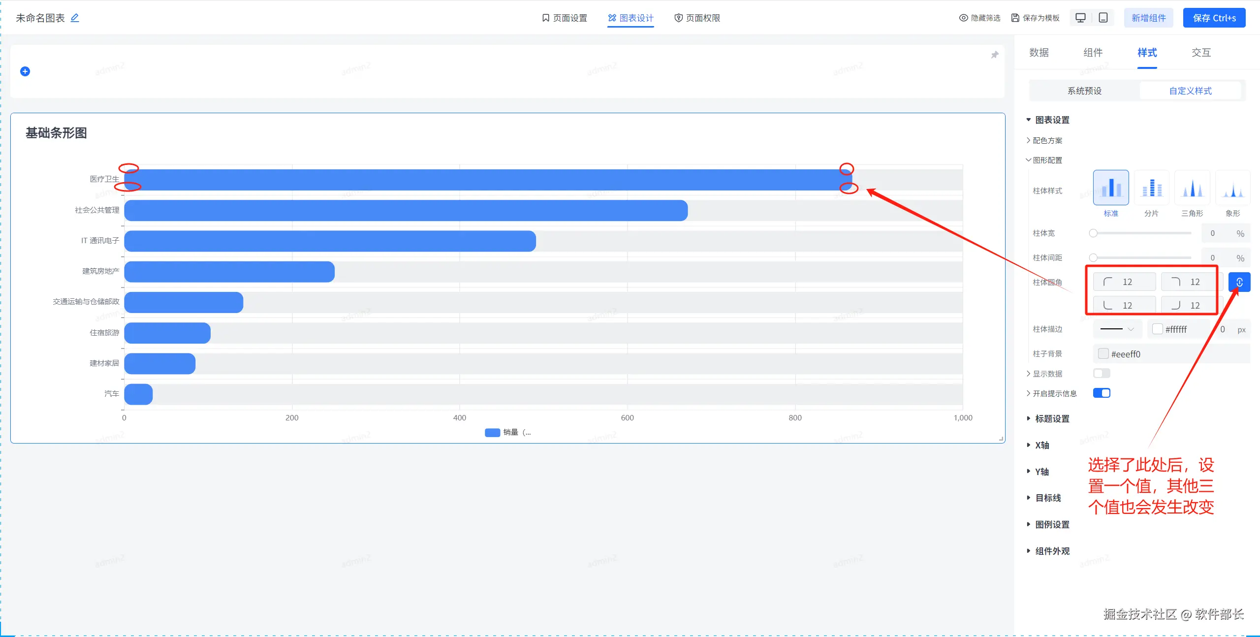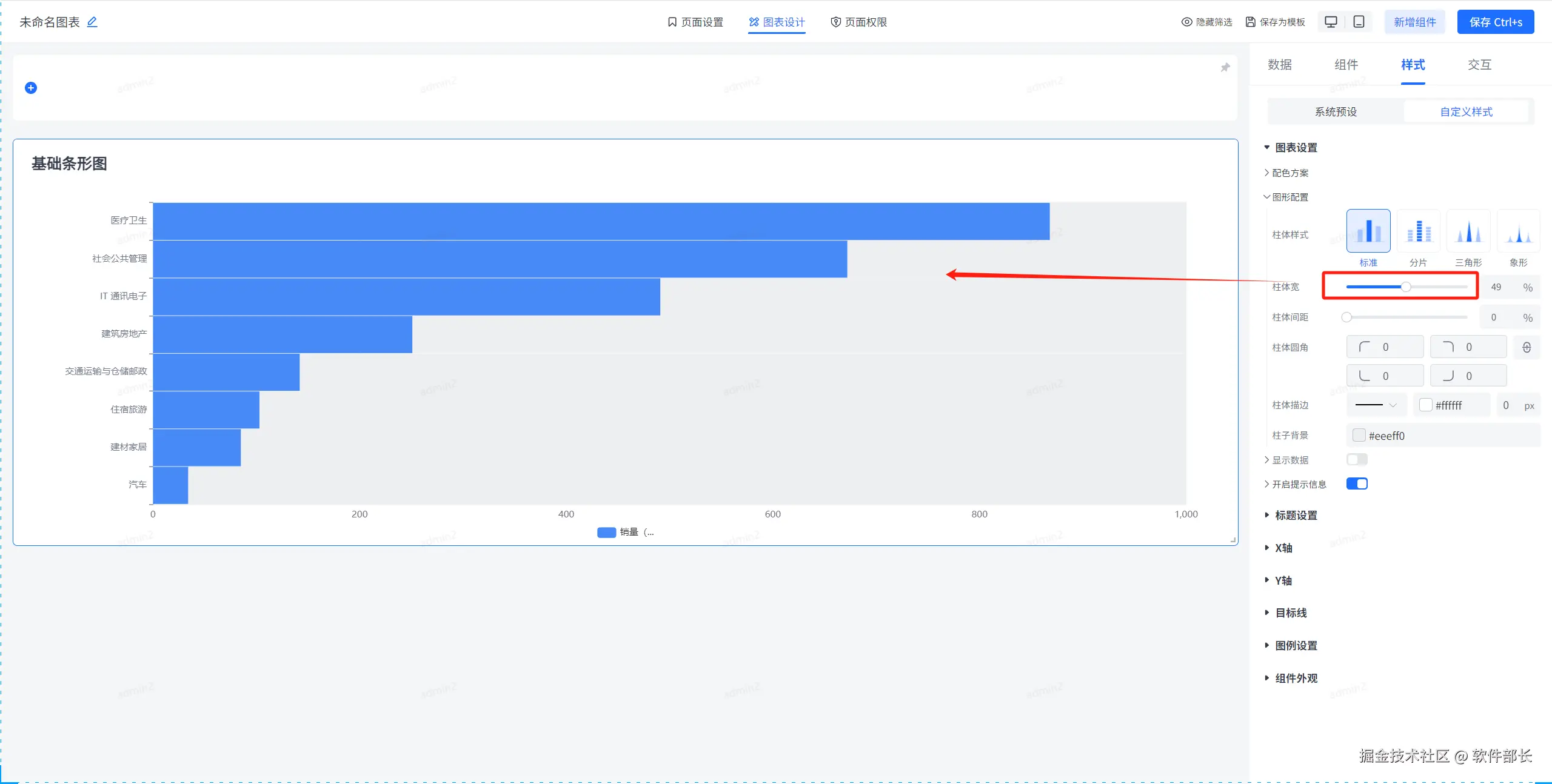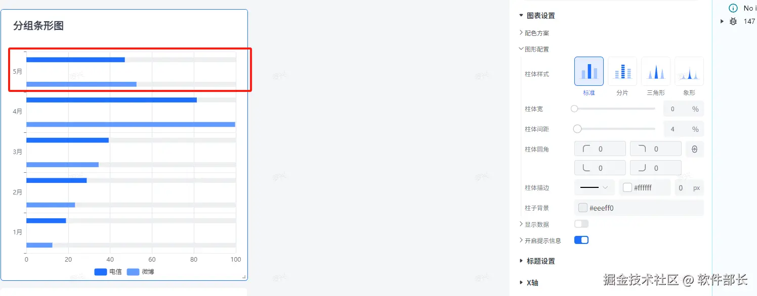 图形配置,主要是对条形图内部柱体的相关配置。主要有柱体样式、背景、宽度、间距、描边以及圆角的样式设置。以下为具体配置方式。