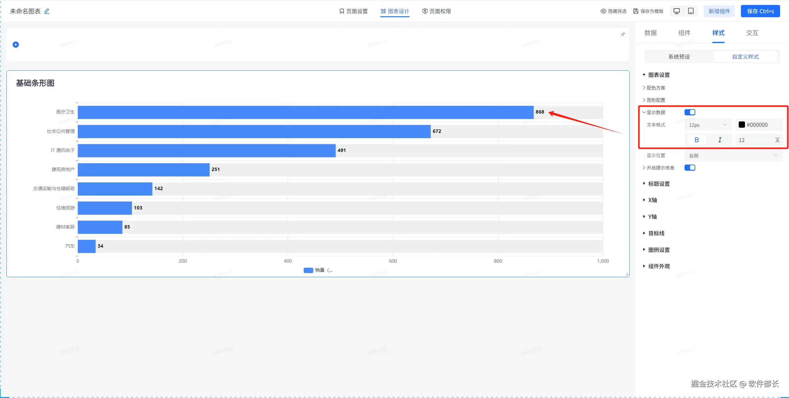 【显示数据】一般用于你数据集选择后,字段和维度的展示。打开显示数据后,可定义数据显示的文字大小颜色、粗细、斜体、上下边距。