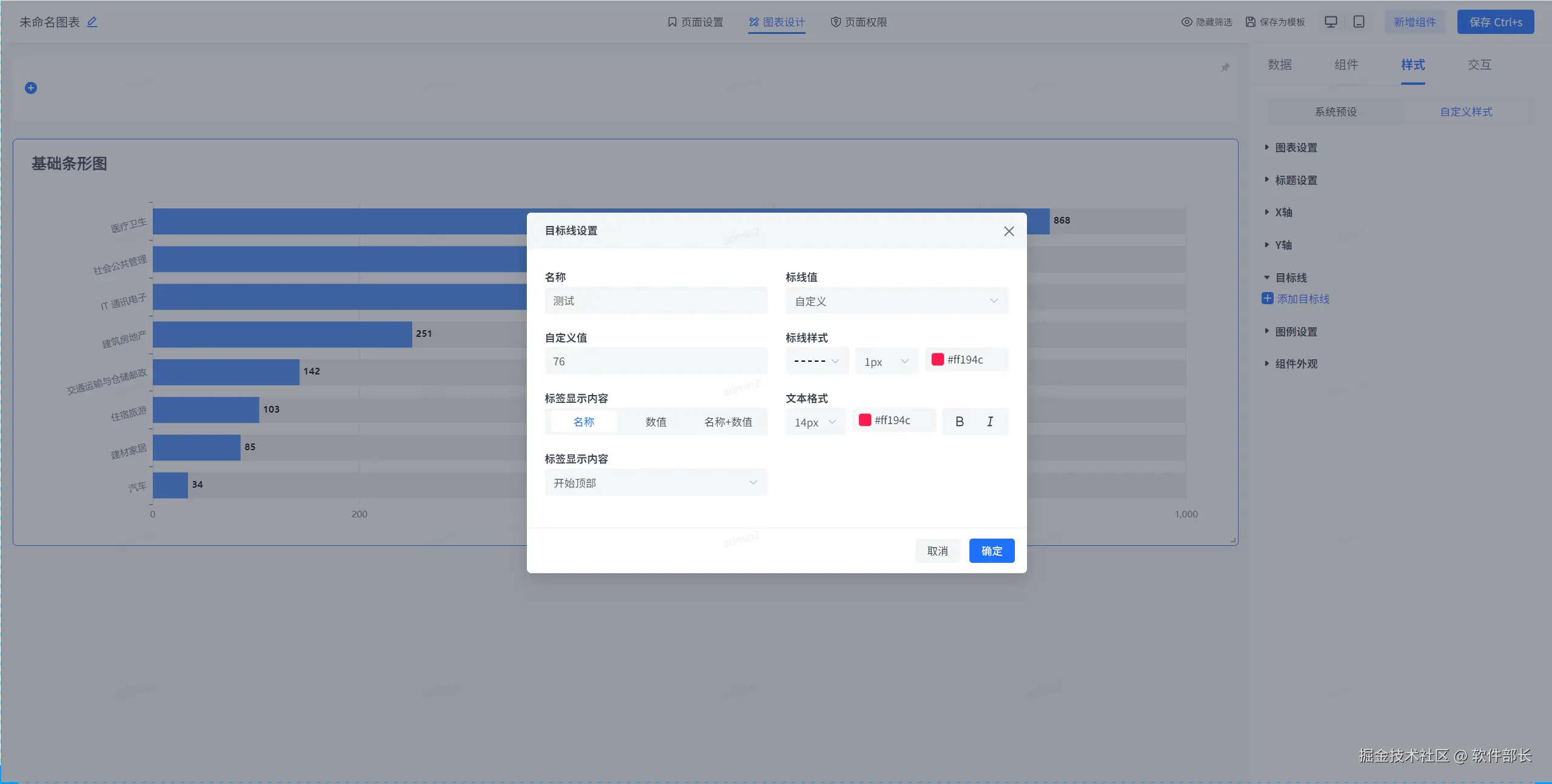 添加目标线,需给出目标线名称、定义目标线种类(可分为自定义、平均值、最大值、最小值)、目标线样式、颜色、大小。以及目标线显示内容是数值还是名称还是名称+数值,同时亦可设置文本标签的大小、样式和颜色。以及文本标签所处的位置是在线的开始顶部、底部、还是居中或末尾顶部或底部。