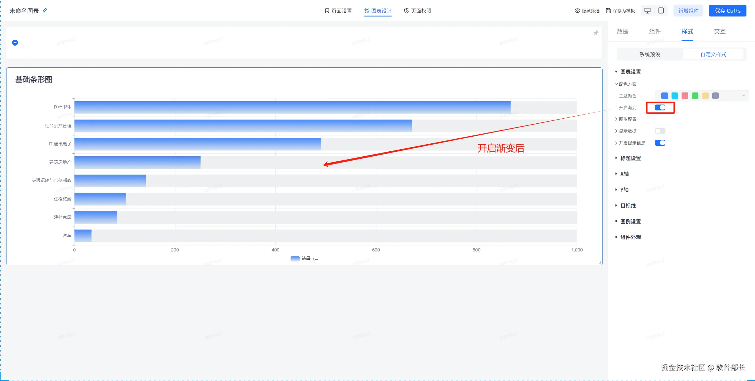 点开【配色方案】,可选择该条形图组件的主题颜色以及是否开启渐变。