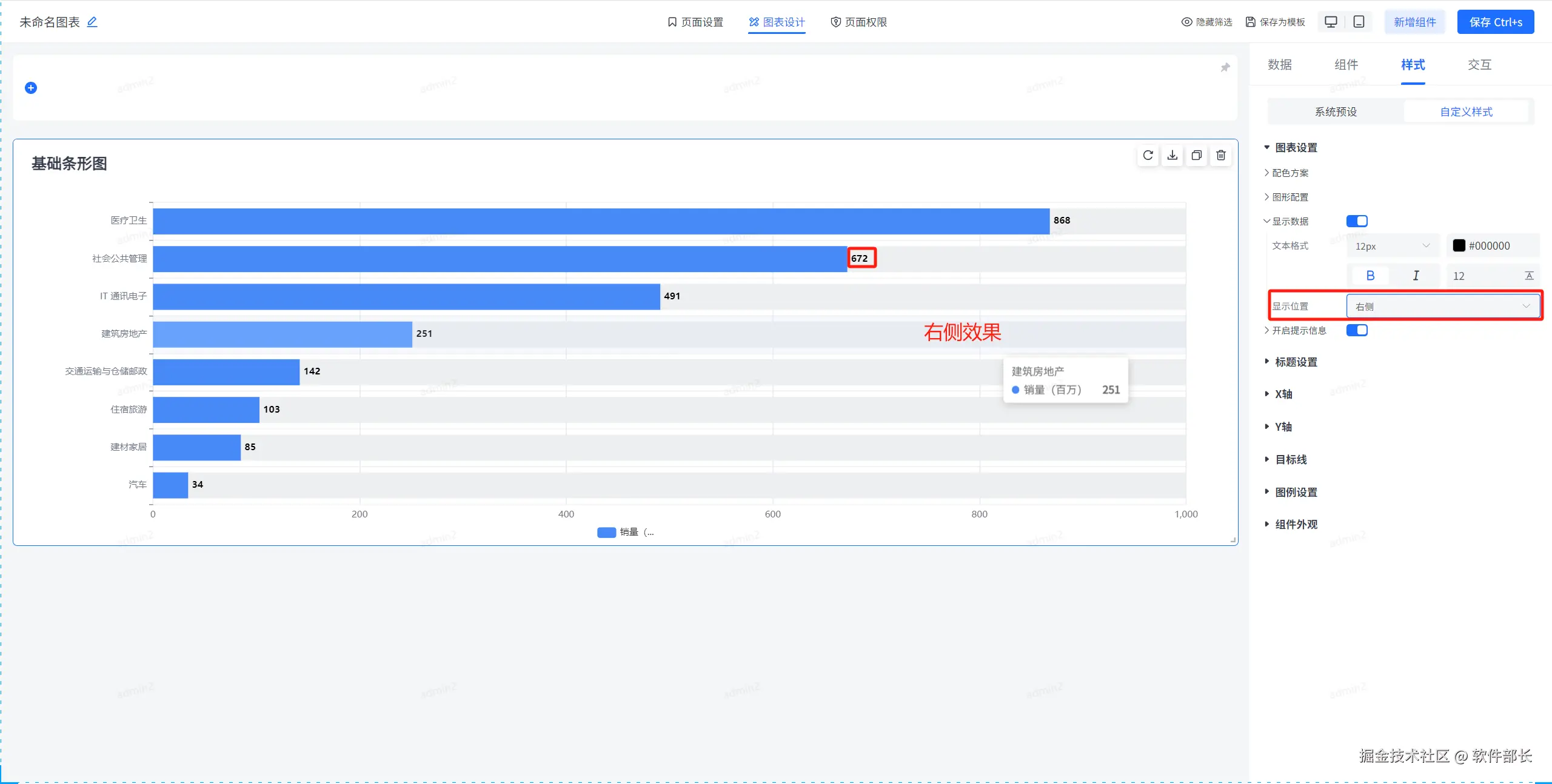 显示位置可定义显示数据在每个柱状的什么位置,可分为内部居中、左侧、右侧、内右侧、内左侧五种。现在分别展示五种方式最后的效果。