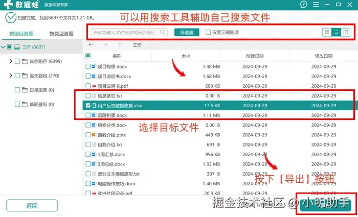 步骤2: 在扫描完成的文件中,可以根据提供的信息找到自己需要找回的文件,选中后点击右下角【导出】的按钮。