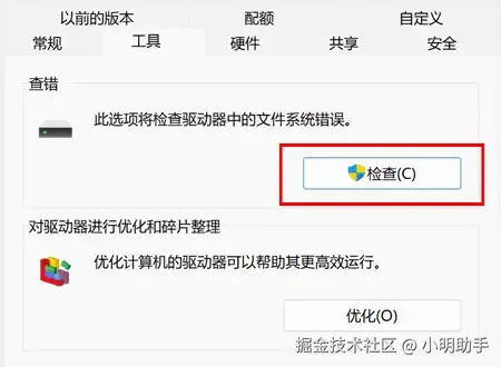 在U盘所在的位置上按下右键,点击【属性】;在【属性】窗口中,点击【工具】的选项卡,在【查错】的板块中找到【检查】的按钮。