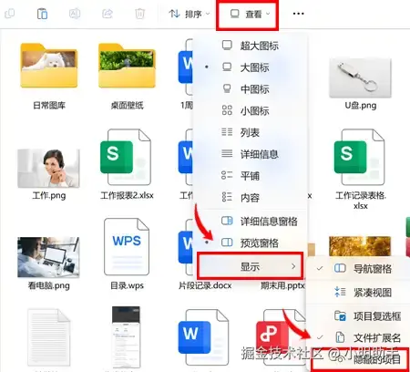 在U盘存储位置里,点击【查看】选项后,在列表中选择【显示】,最后点击【隐藏的项目】。