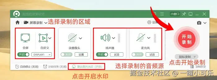 步骤2:选定录制模式后需配置相关参数,可以单独捕获系统音效或者启用麦克风收音。视频范围可以通过拖拽边框自定义。如果你想添加标识可以在设置面板开启 “图片水印” 选项并进行自定义。参数确认无误后,点击红色录制键就可以开始录制视频啦!