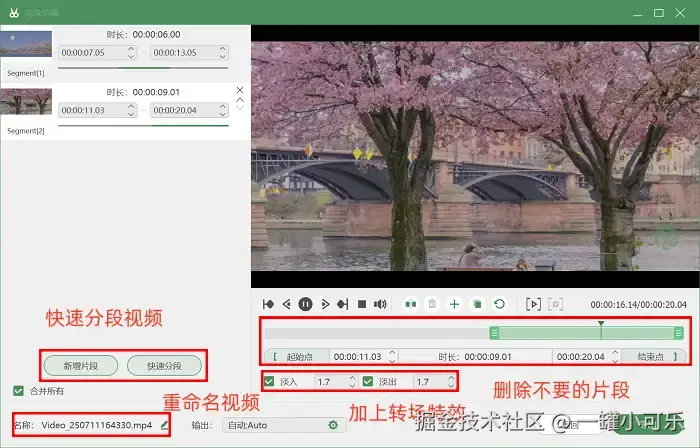 步骤3:结束录制时系统将会自动保存文件至预设存储路径,用户可通过软件左侧导航栏的 “历史录制” 模块快速检索。还可以使用该工具内置基础剪辑功能,进行片段截取、增加转场特效等操作。