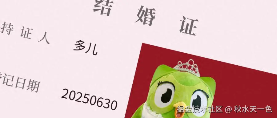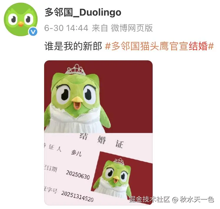 咳咳,切回正经营销分析内容,2025年6月30日,全网知名教育类应用、语言学习App中的NO.1、最会玩梗的官方——多邻国,开始全网“征婚”,并火速附上一张结婚证官方照片。文案更是无声胜有声地在笔者脑子里激情回响“谁是我的新郎~~~”