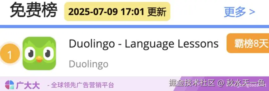 根据广大大-App Intelligence功能可知,我们多邻国常年霸榜全球AppStore教育免费榜TOP1,除了产品过硬之外,自身营销水准也是一众教育应用里的顶尖梯队。