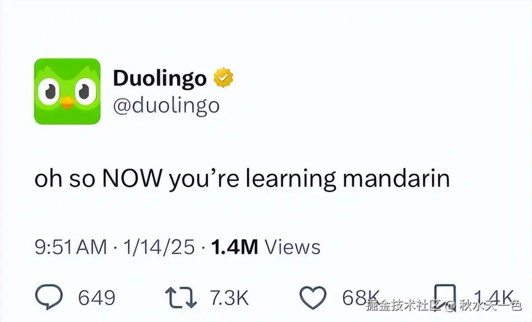 除了自造梗以外,多邻国还极其擅长蹭热度。像是之前Tik Tok惨遭封禁,TT难民集体逃往小红书时,多邻国就开启了“嘲讽”Max模式,“现在你要学普通话了”,