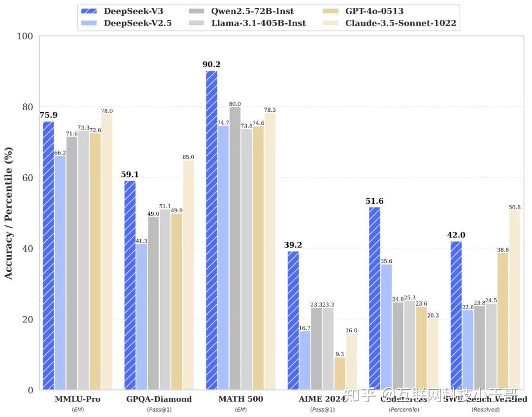 在数学上,在美国数学竞赛(AIME 2024, MATH)和全国高中数学联赛上,DeepSeek-V3 大幅超过了所有开源闭源模型。