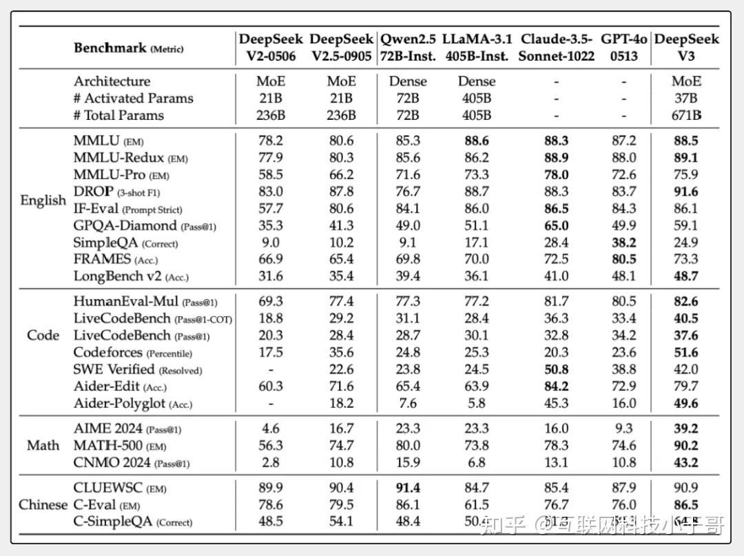 总的来说,DeepSeek-V3成绩已经可以媲美一些主流的闭源大模型了