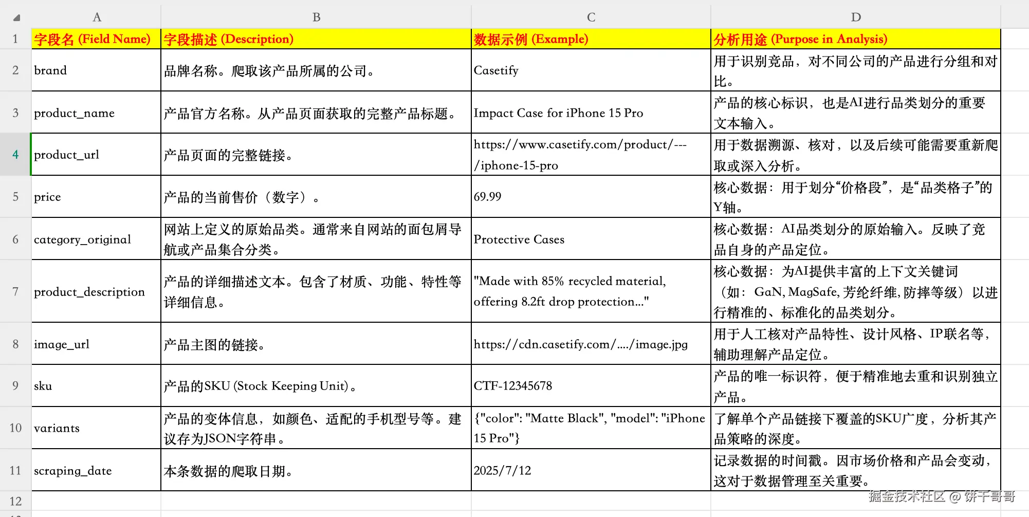 但采集之前,我们也得知道要采集什么,可以让 AI 先根据我们的分析方法给我们一个数据字段要求.csv