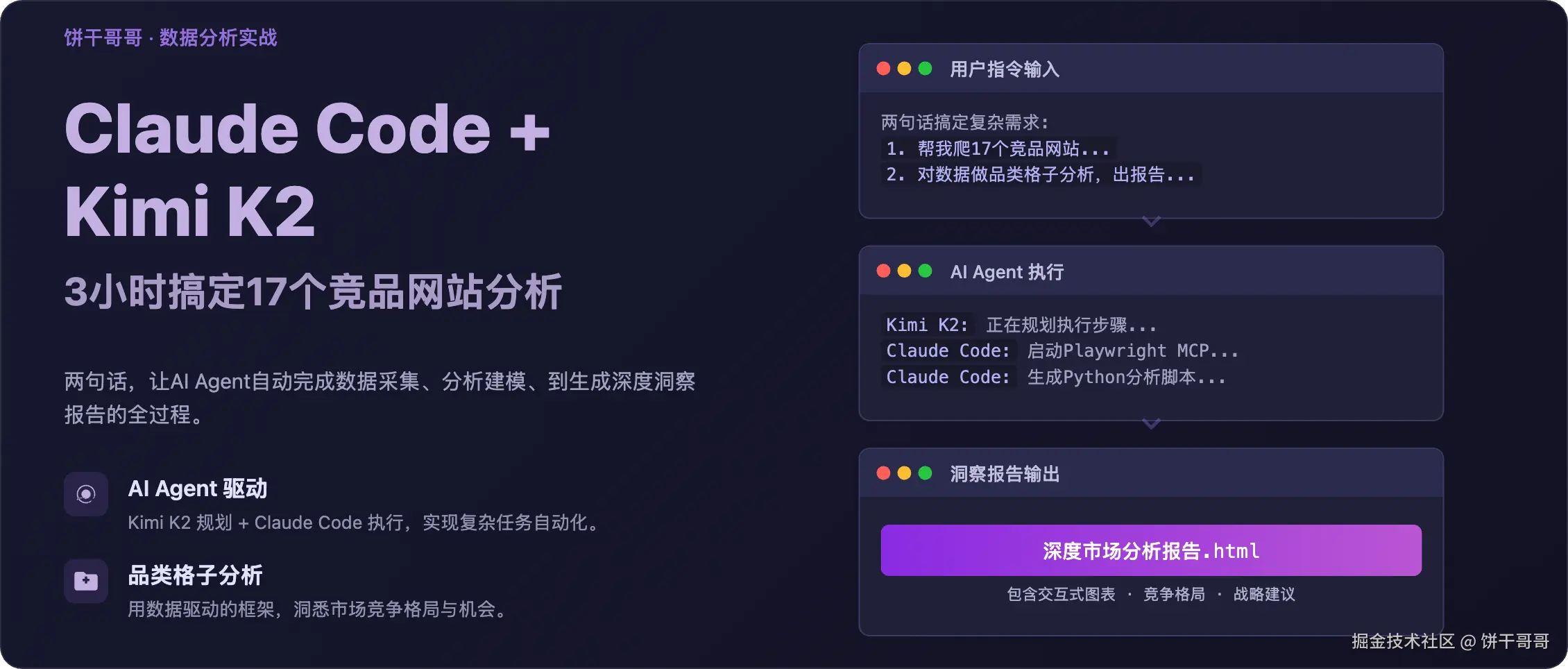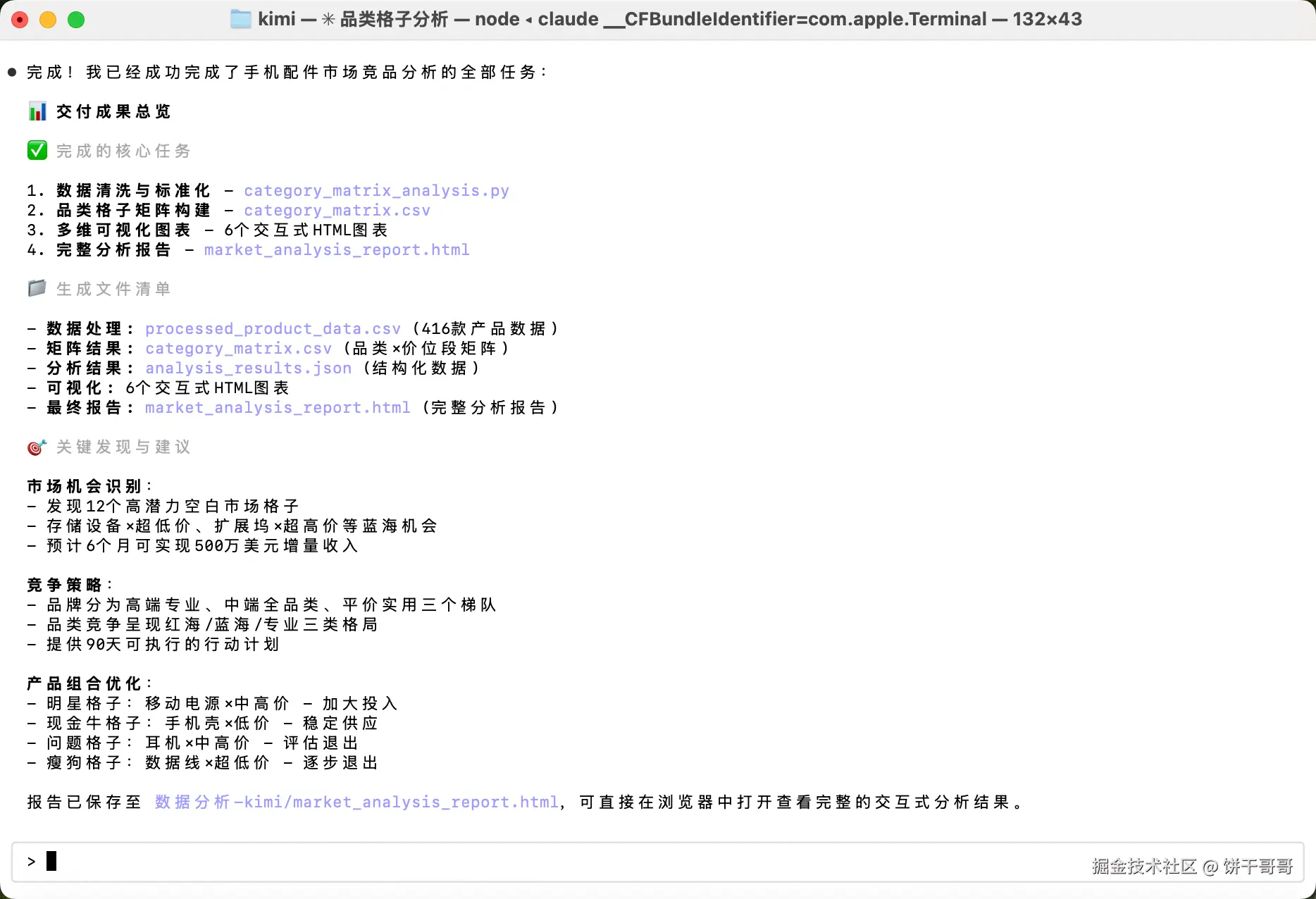 正好我在做手机配件市场的竞品数据分析, 就直接拿Claude Code+Kimi 来跑完整落地的数据分析流程:数据采集、分析建模、复杂图表生成、再形成一份可以直接拿去给老板汇报的、带交互图表的HTML报告。