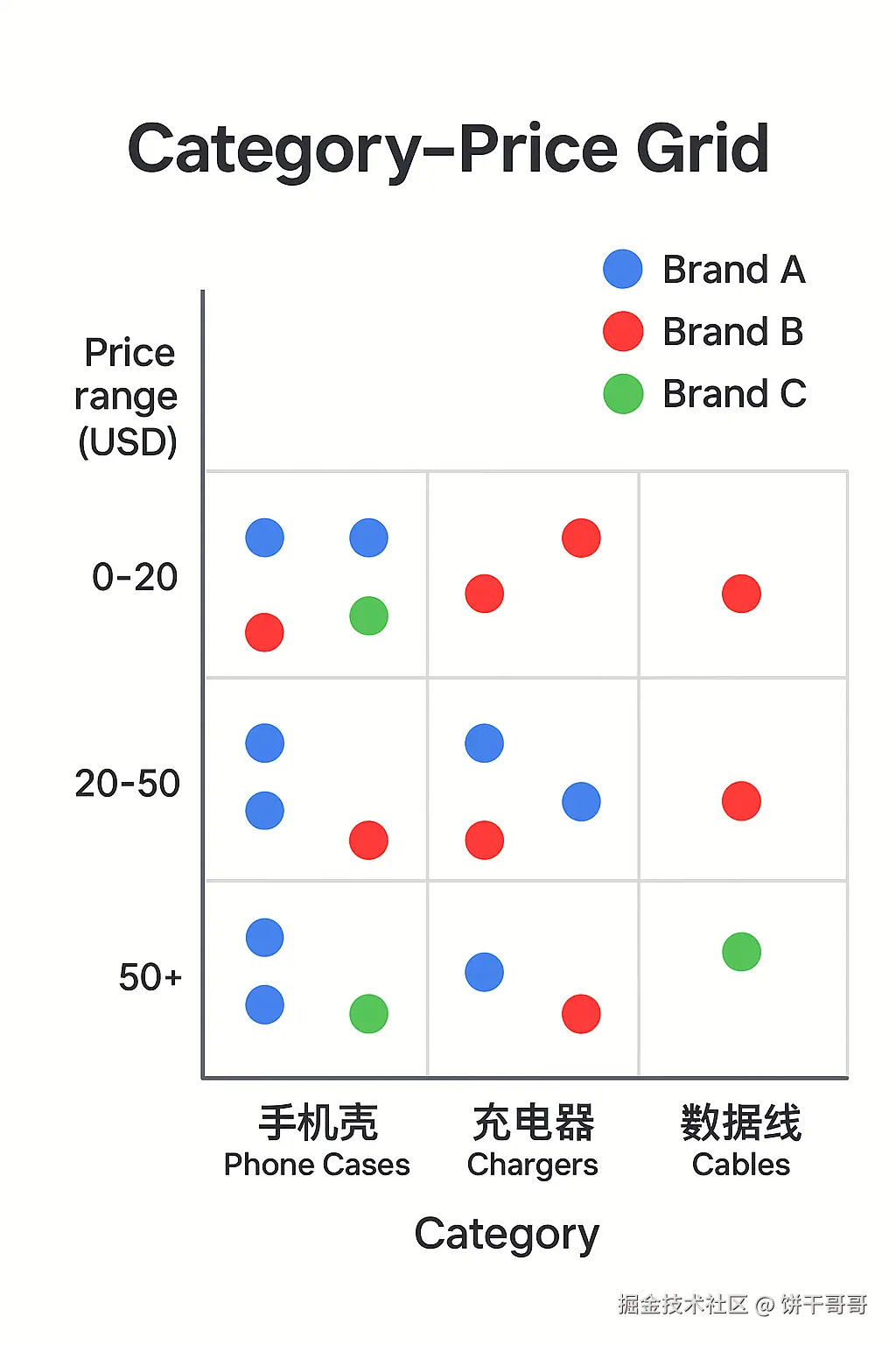 品类格子, 简单来说,就是把市场按“品类 x 价位段”画成一个棋盘,然后看你和你的竞争对手们,分别在哪些格子里落子,哪些格子还是空白。