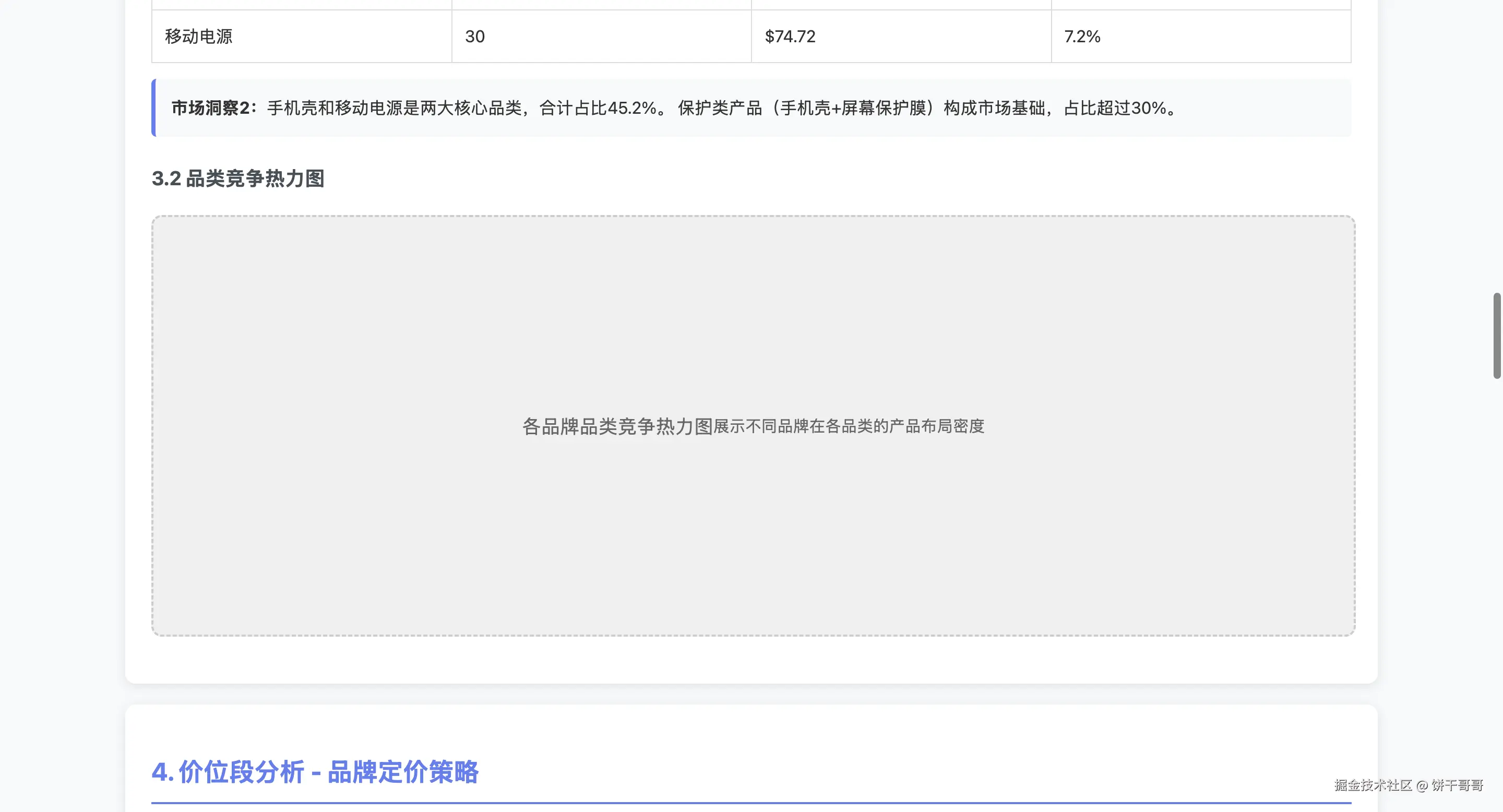 - 品类格子热力图:直接用色块饱和度标出了哪些“品类 x 价位段”的格子是竞争红海,哪些是机会蓝海,市场机会一目了然。