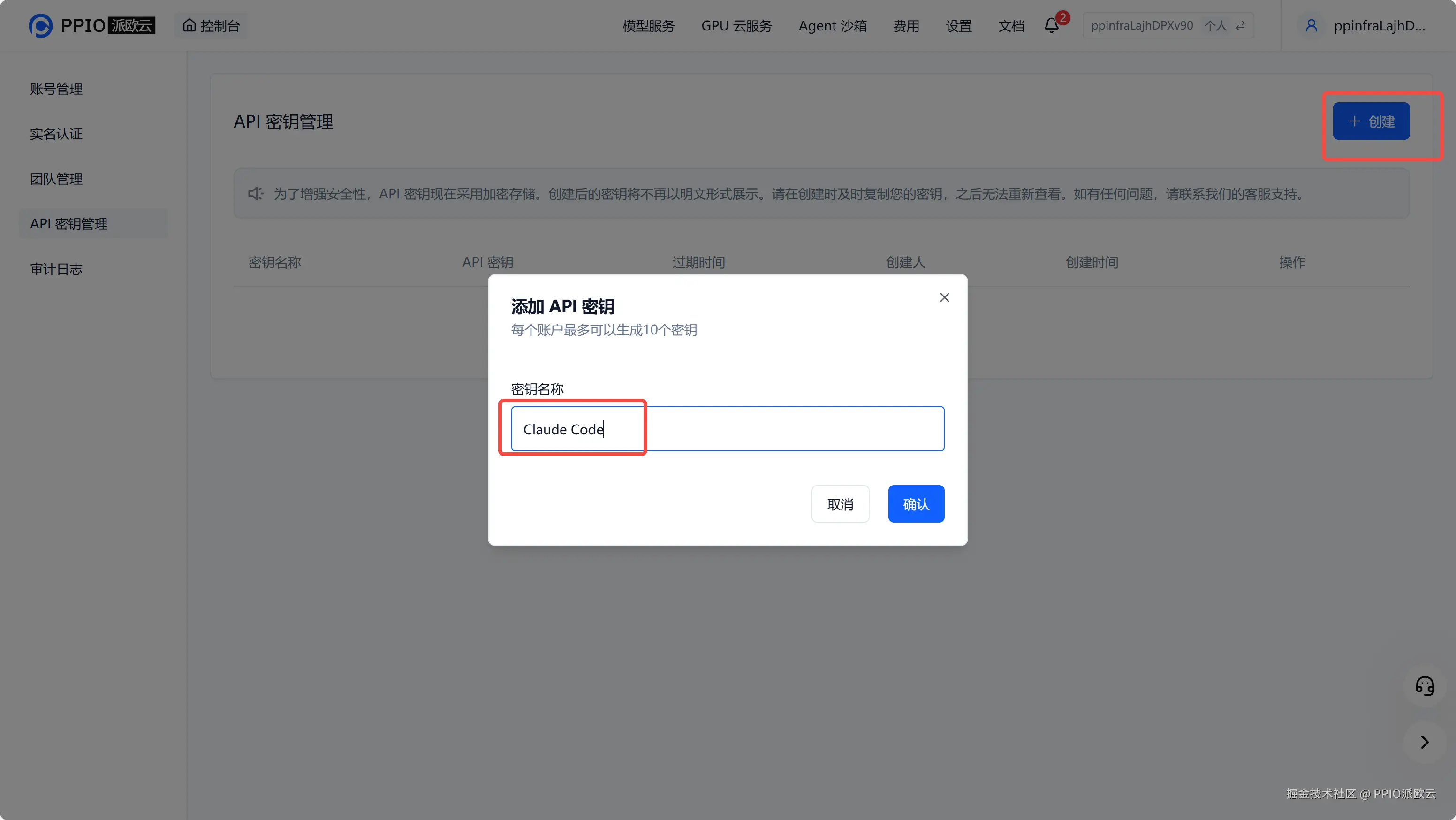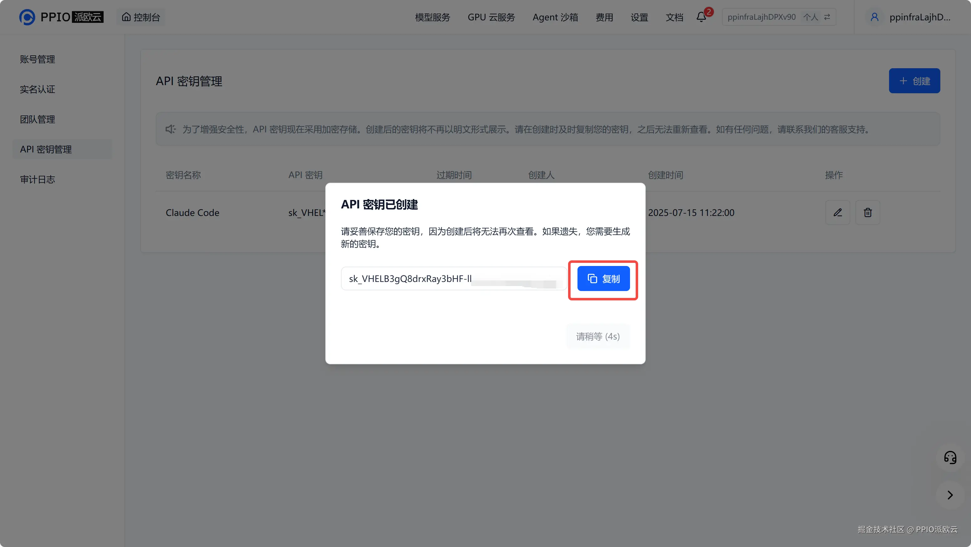 2. 生成并保存 API 密钥