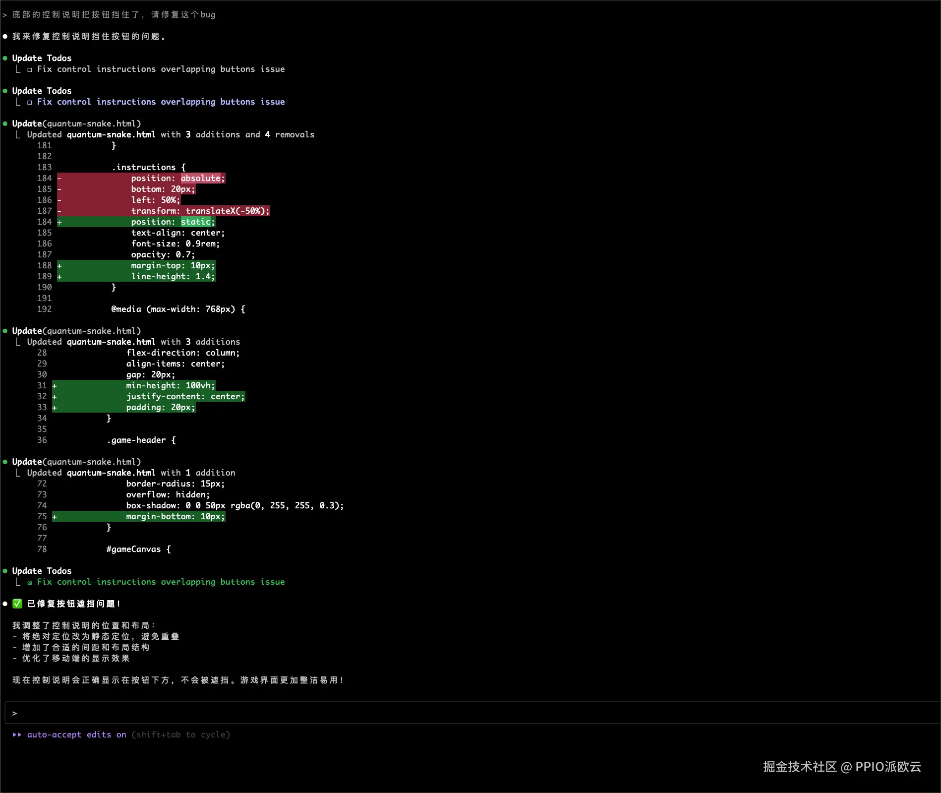 可以看到上面生成的结果存在一个 bug:底部的控制说明文本把按钮挡住了。接下来我们继续输入需求,并让 Claude Code 修复这个 bug。