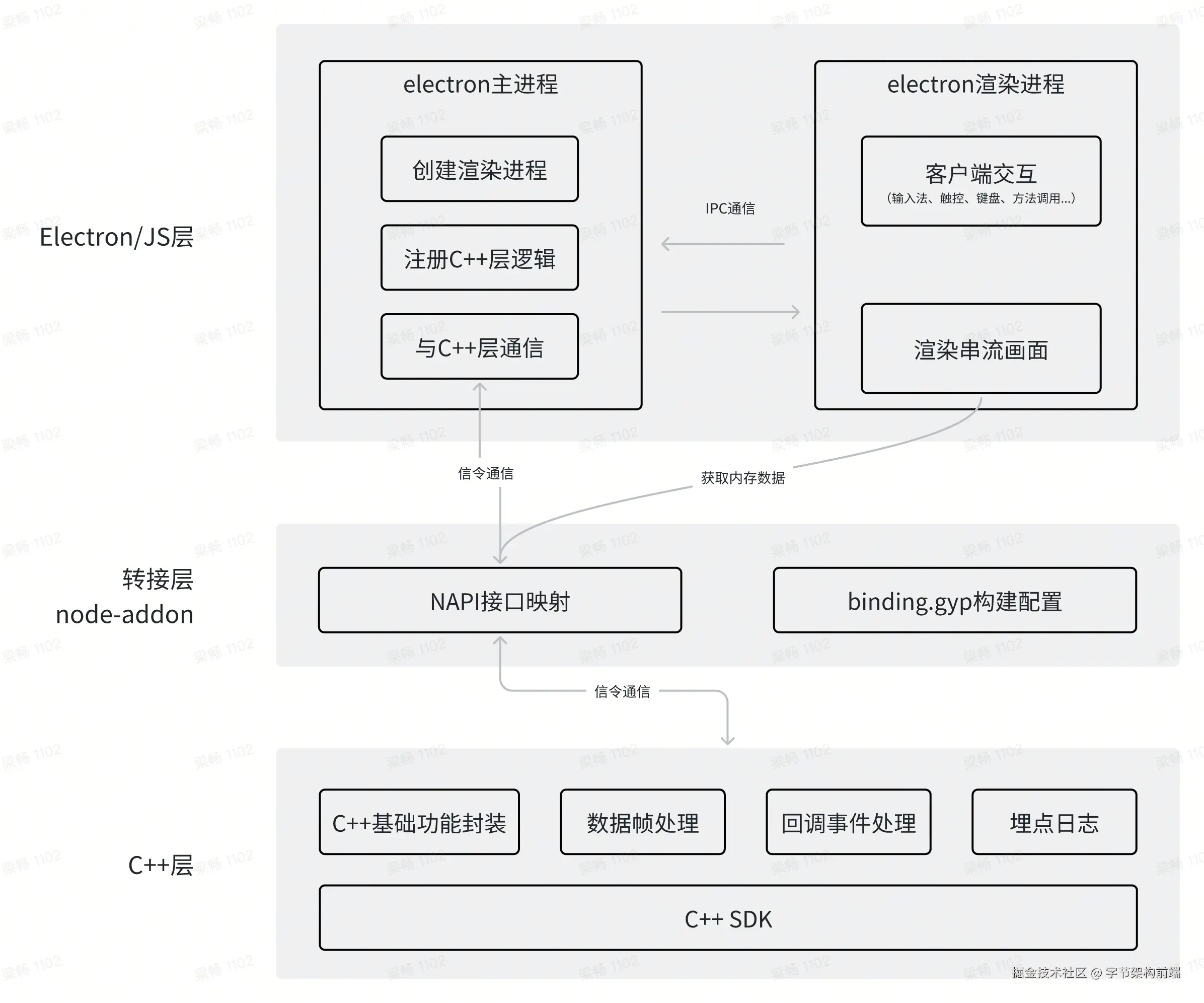 了解当前集团内在 Electron 场景下,Web技术栈在视频/图片处理上支持对原生组件混合调用,使集成方可以以纯Web技术栈即可轻松集成原生组件的视频处理能力。即 C++ 原生组件处理视频帧/图片数据,在 Web 页面某块区域渲染