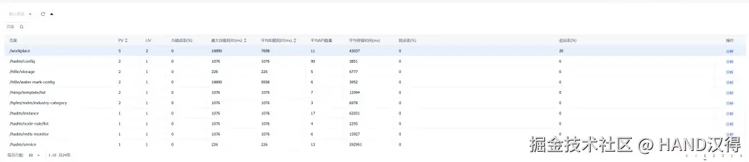 页面列表总览,全面掌握核心表现:按应用和时间维度,统计各页面的 PV、UV、JS 错误率、请求成功率、跳出率、平均停留时长等关键指标,支持快速定位异常页面并查看详细分析数据。