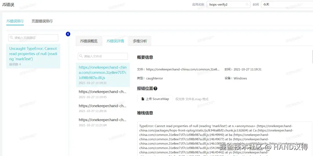 - JS错误概览:统计展示应用前端JS错误统计数据,错误简要信息、发生JS错误的页面,JS错误次数等。