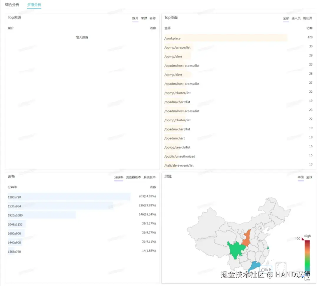 - 多维分析:从设备、地域角度,分析统计一段时间内某页面的JS错误数。